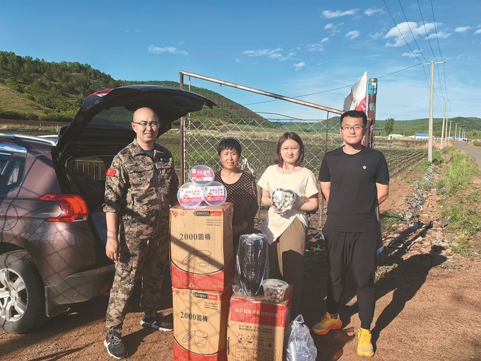 高双(右二)给草莓种植户配送包装盒。(东山村村委会供图)