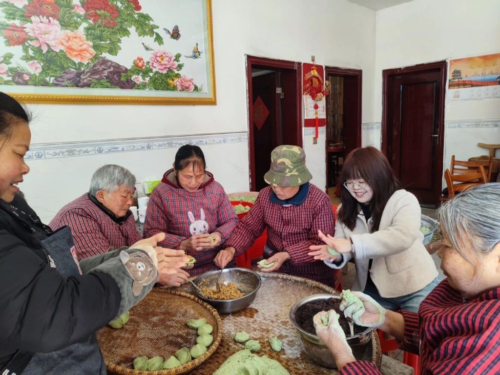 我常常一边学习,一边探索如何进一步丰富村民精神文化生活。小年前后,外出务工年轻人陆续返乡,我趁机在村里组织全家福拍摄活动。“这是我们家第一张三代同堂的全家福哩!”“全家福拍得真好,我要贴在墙上”。村民们的反馈让我感受到了用镜头定格幸福的意义。清明节前,村里组织了包艾米果(青团)活动,我用镜头记录村民做艾米果的过程并投稿到官方媒体。“小玲,我女儿打电话说看到我们做艾米果的活动上了‘新闻’咧!”胡奶奶激动地对我说。