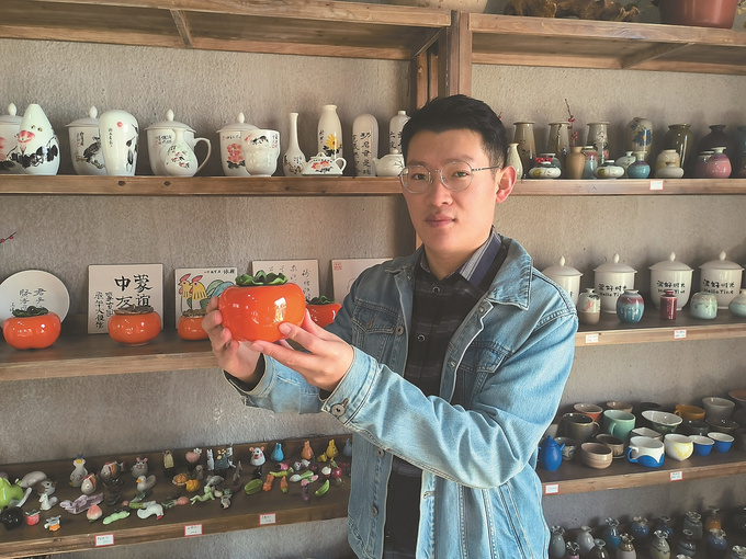 王昊程展示陶艺作品。(坨头寺村村委会供图)