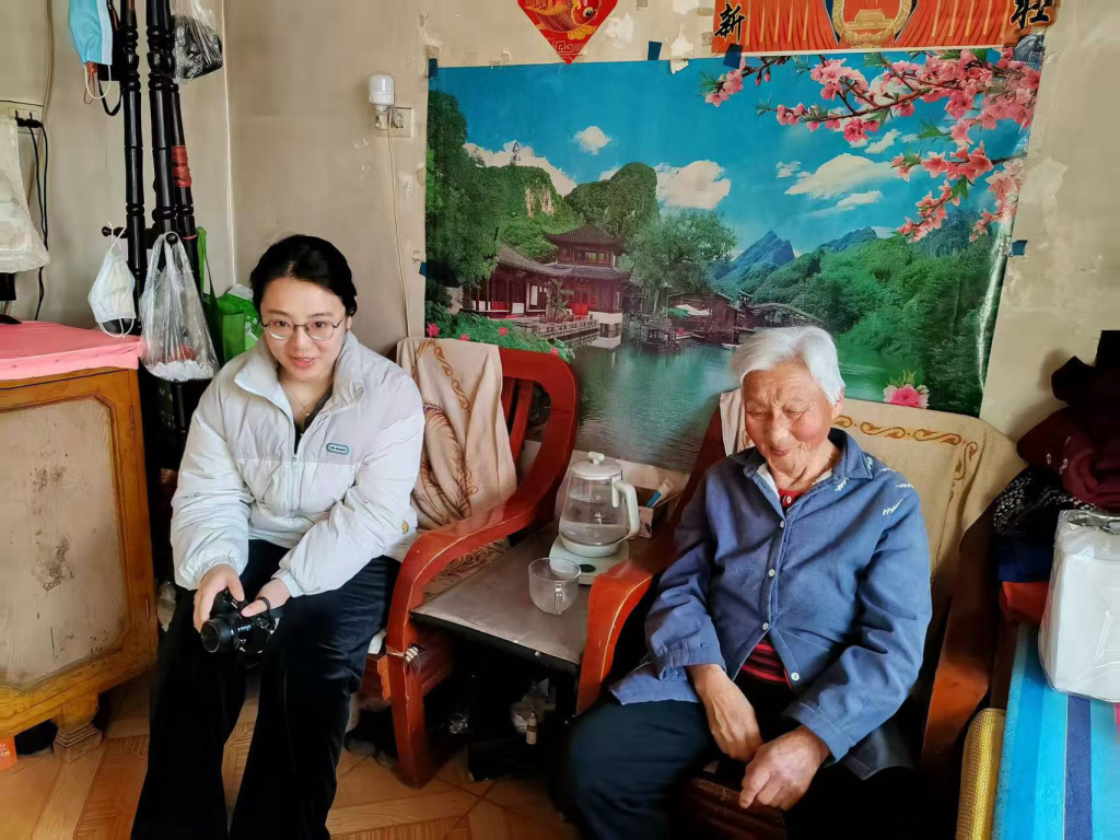 彭佳琪(左)正在和老人商量拍摄事宜。(高泽村村委会供图)