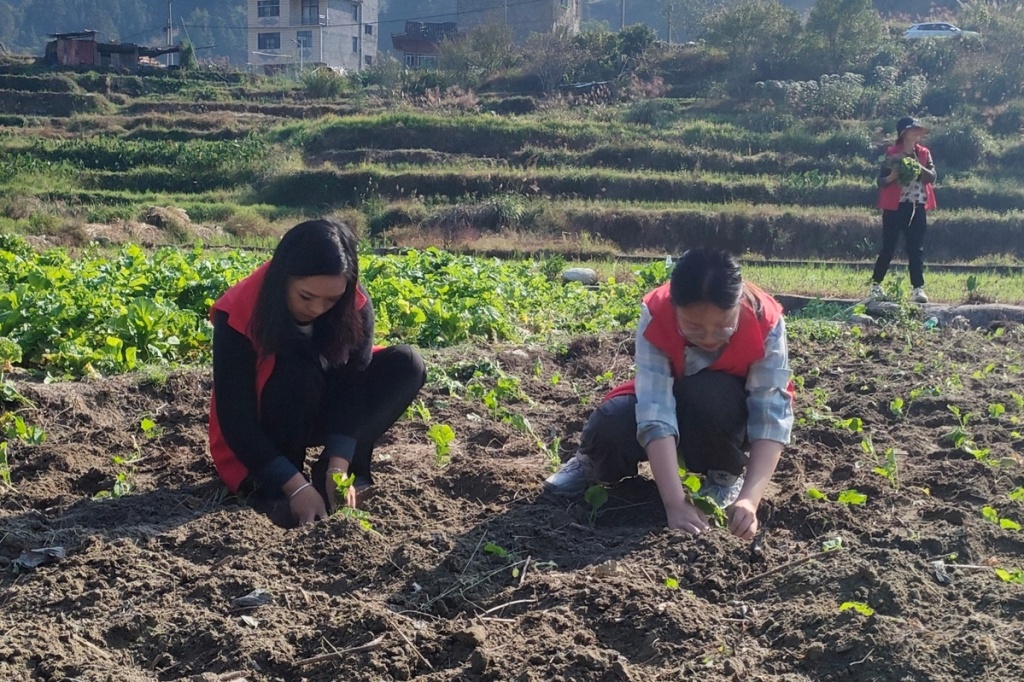 石倩(中)和村干部帮助村民移栽油菜苗。(桥乌村村委会供图)