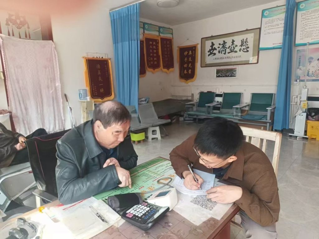 胡红立(右)在元里村卫生室入户排查房屋情况。(霸州市委组织部 供图)