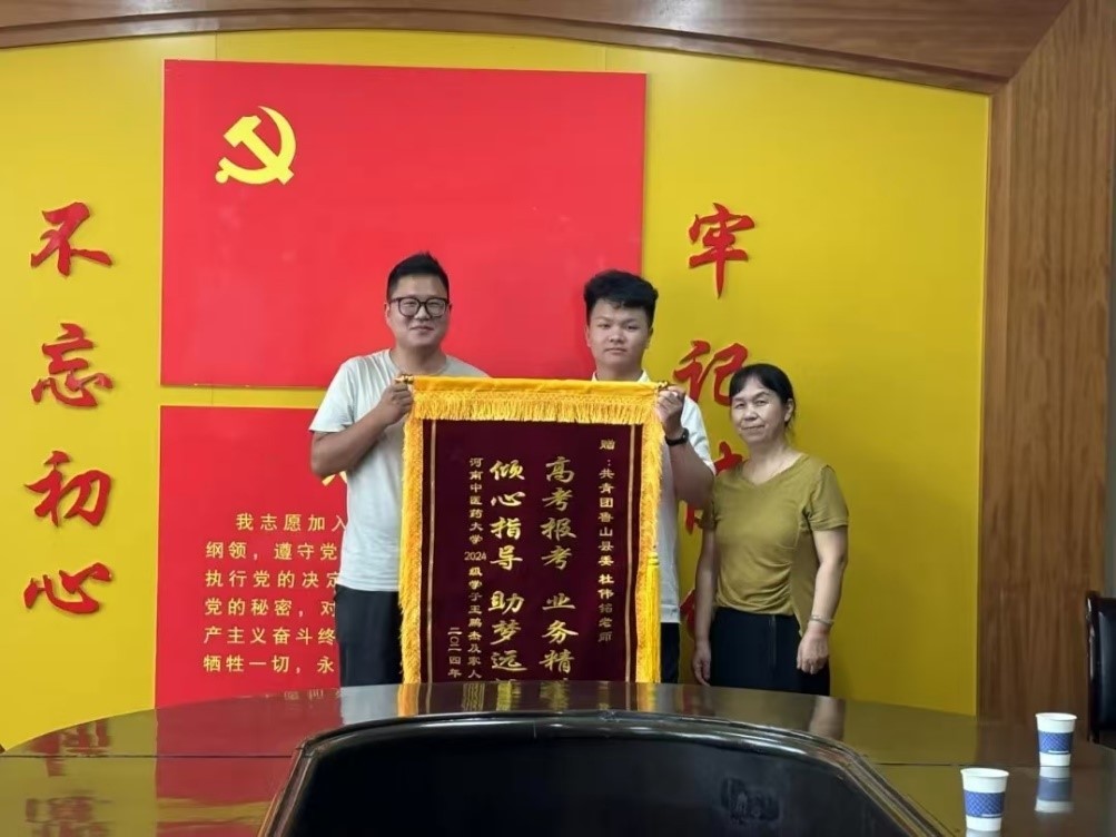 杜伟铭(左)接受报考录取学生及家长代表赠送的锦旗。(共青团鲁山县委供图)