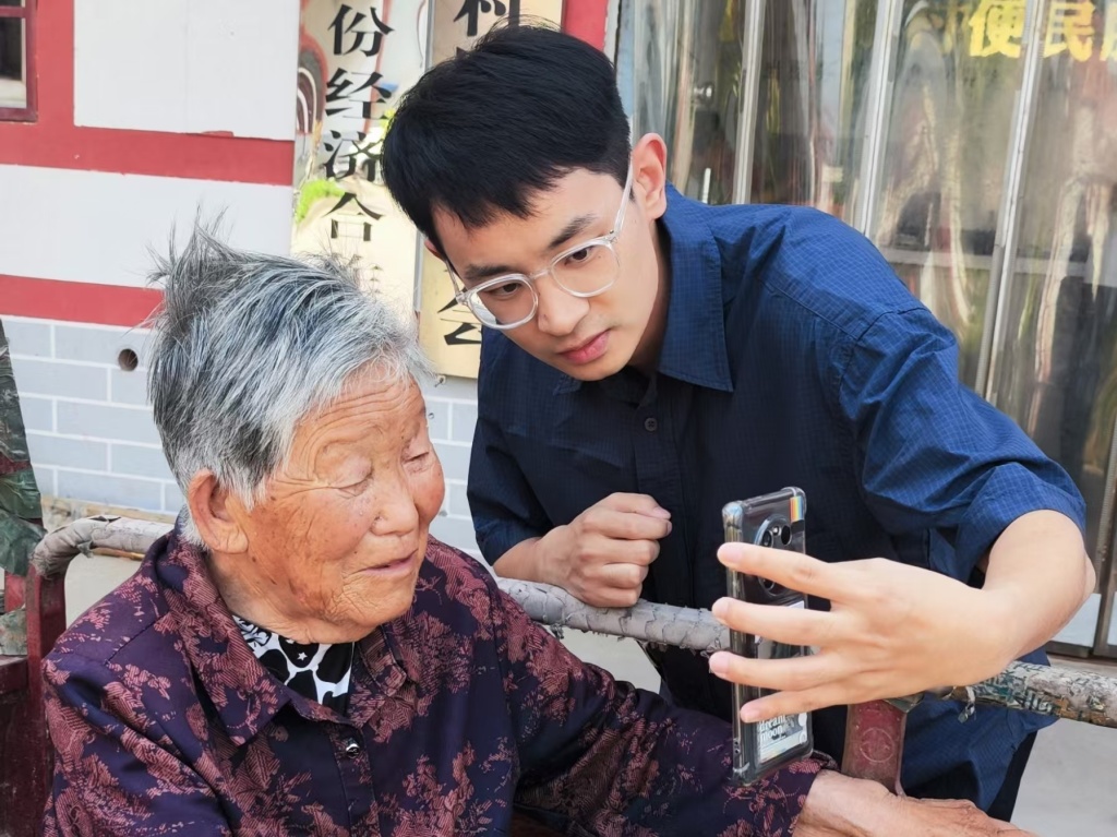 石文喆(右)帮助老人进行养老保险认证。(瓦岗寨村村委会供图)
