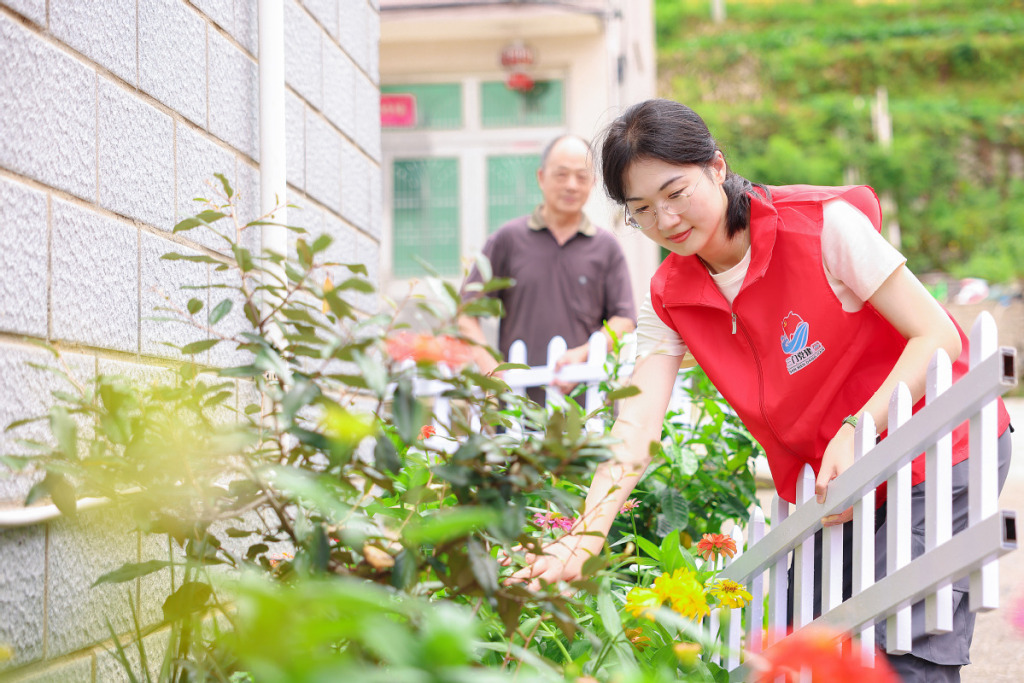 潘晶晶(右)帮助村民完成“一米花园”布局设计。陈昌晖 摄