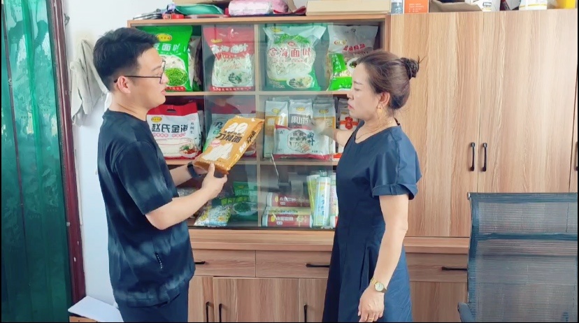 任明源(左)在挂面厂对接线上销售情况。(修武县委组织部供图)