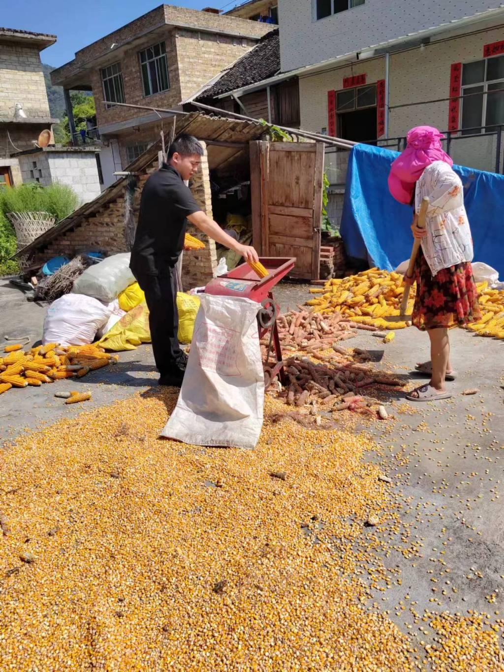 梁建东(左)帮农户晒玉米。(荔波县委组织部供图)