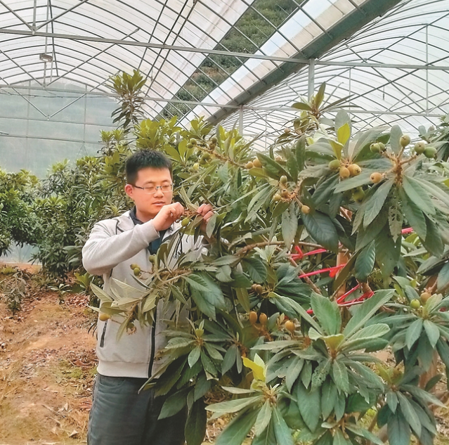汪智杰查看枇杷生长情况。(南屏村供图)