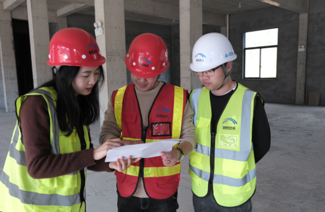 徐娜(左一)在村植物园大楼与设计师商量设计方案。(黄岩区委组织部供图)