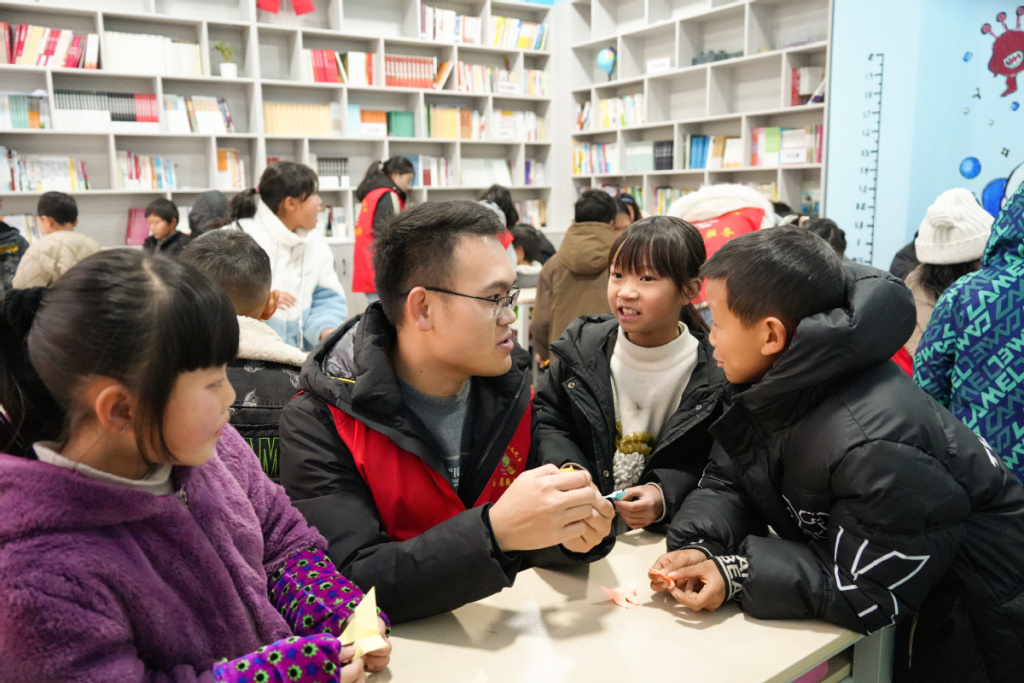 龙洪泽教孩子们手工折纸。(黔西南州委组织部供图)