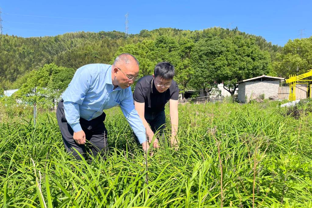 培斜村党支部书记华锦先(左)与罗越察看村里的中草药园。(作者供图)