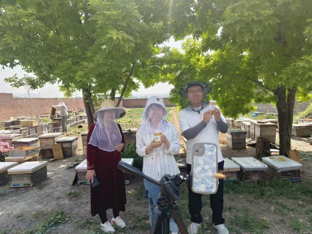 王僮(右)和东洼子村村干部在直播间售卖农家蜂蜜。(东洼子村村委会供图)