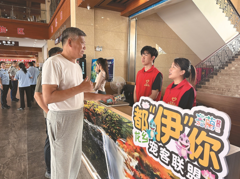 秦泗涵(右二)在向阳乡党员志愿服务驿站为游客进行旅游线路讲解。闫安庆 摄