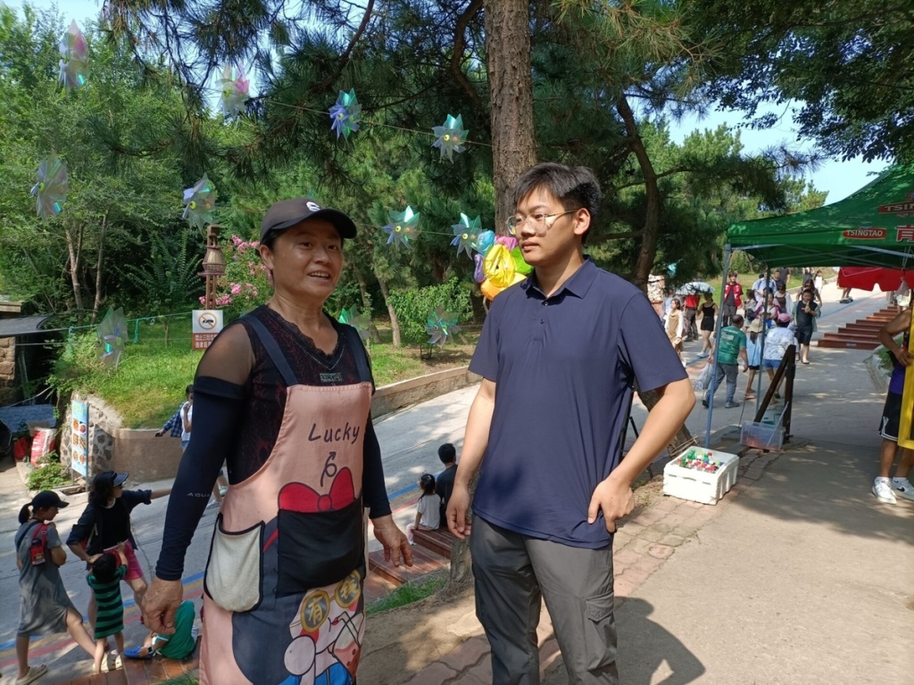 选调生郭家宁(右一)调研了解村民旅游收益情况。(威海市委组织部供图)