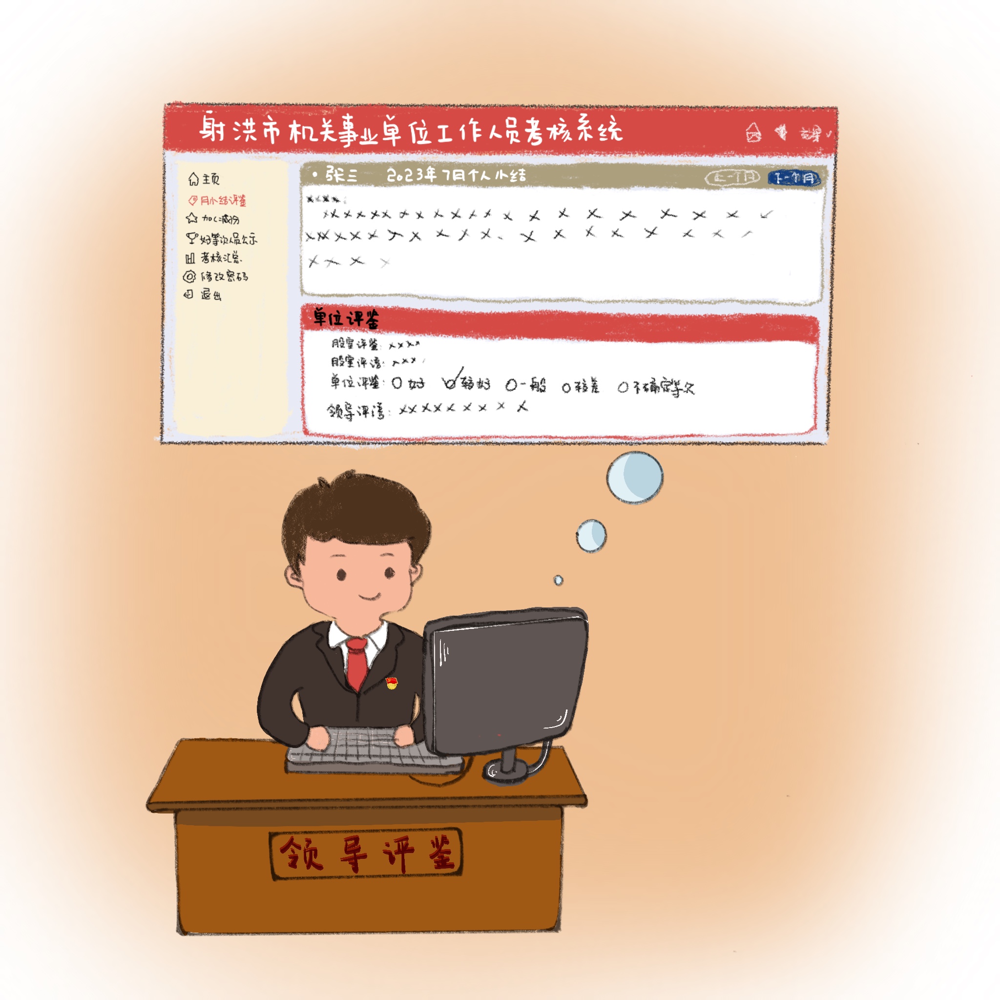 逗硬实施“跟着奔”,强化对平时考核工作的管理落实“引好路”。按照干部管理权限,依托“射洪市机关事业单位工作人员平时考核系统”,以月为周期有序地推行平时考核工作实施,按时开展工作月计划、月小结、月评鉴,让干部的工作实绩量化、质化、可视化。坚决不搞“轮流坐庄”“平均主义”,根据干部平时工作情况,公平公正地评定等次,并及时公示。通过干部从平时关注干部成长动向,从突显的差异中做好“分类管理”,让“躺平式”干部“不错位”。
