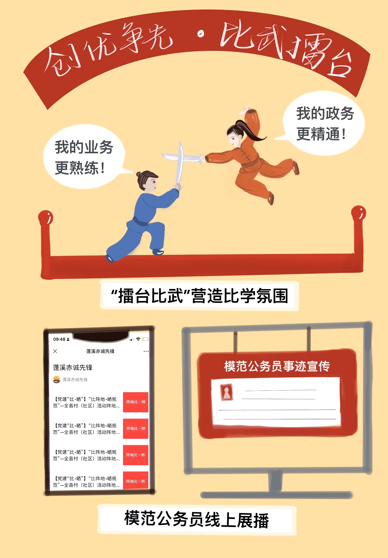 “擂台比武+事迹展播”,营造比学争先浓厚氛围。依托“组工讲堂”,搭建“创先争优”比武擂台,全覆盖开展比政策精通,看业务熟练、看操作规范的“一比两看”大练兵活动,坚持目标与责任结合、激励和约束并重,着力营造公务员队伍良好氛围,2022年以来评选优秀公务员245名,推动全县公务员在岗更在状态。依托“赤城先锋”微信公众号,开设“模范公务员”线上展播栏目,定期选树优秀公务员,展播先进事迹,充分发挥先进榜样引领作用,大力营造崇尚模范、学习先进的浓厚氛围,激励广大公务员比学赶超、干事创业,增强公务员队伍凝聚力。