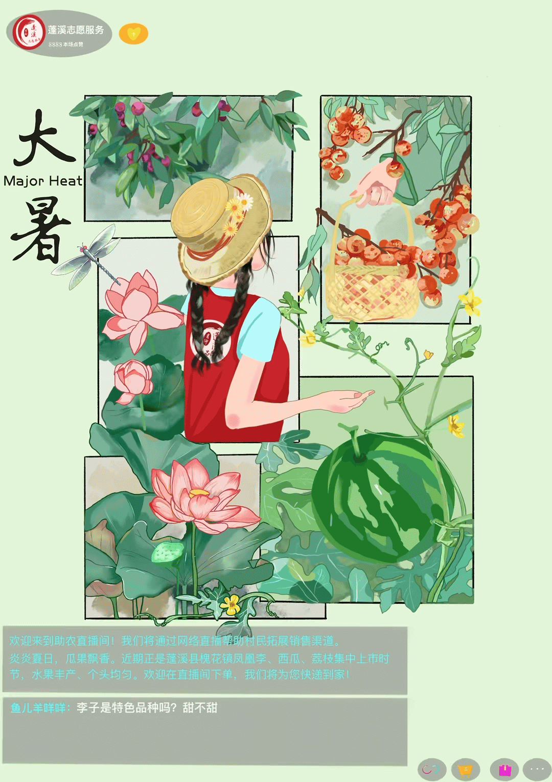 大暑至盛,万物荣华,大暑标记着瓜果飘香的丰收,更是农民增收的关键期。主动减少农民的滞销忧虑,努力让瓜果对外畅销,需要让乡村振兴插上“互联网”的翅膀,通过“直播带货”,展示乡村风情,助推当地农产品销售,这是成长在新时代青年干部的天然优势,看着“村播助农”镜头下村民腼腆却藏不住的笑脸,我也倍感自豪。