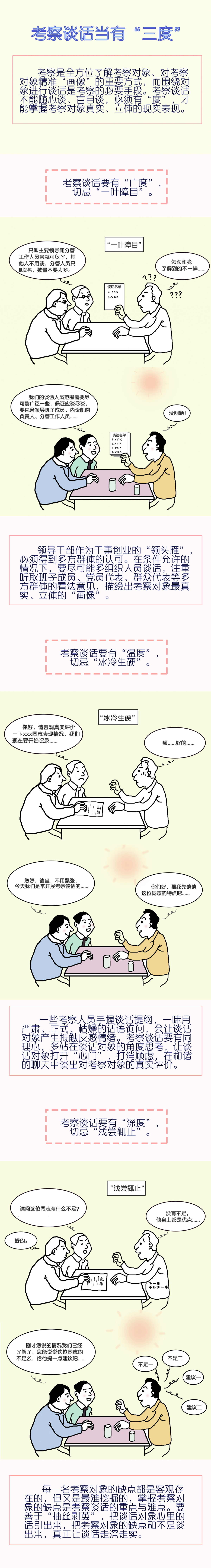 考察是全方位了解考察对象、对考察对象精准“画像”的重要方式,而围绕对象进行谈话是考察的必要手段。考察谈话不能随心谈、盲目谈,必须有“度”,才能掌握考察对象真实、立体的现实表现。