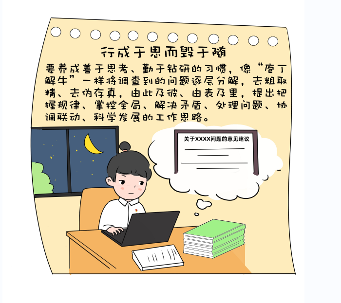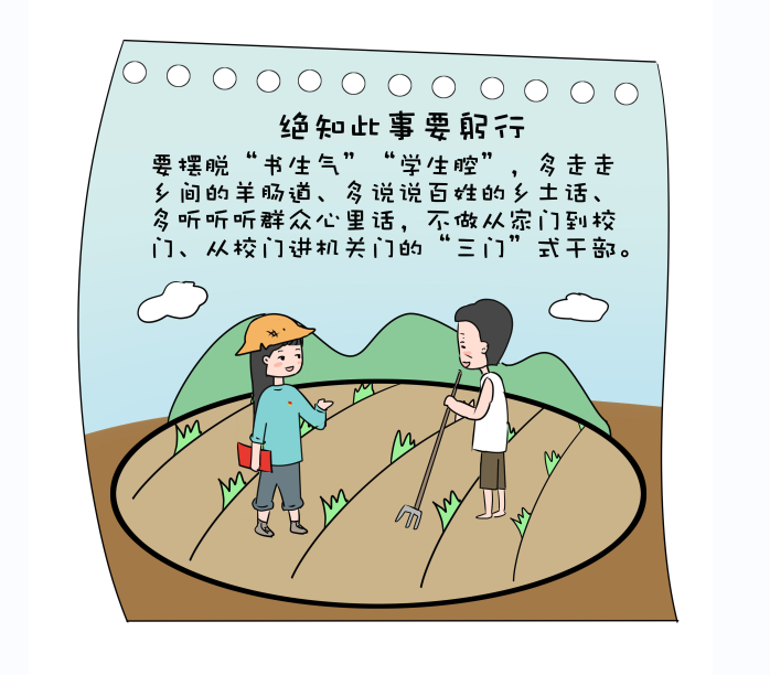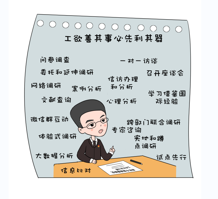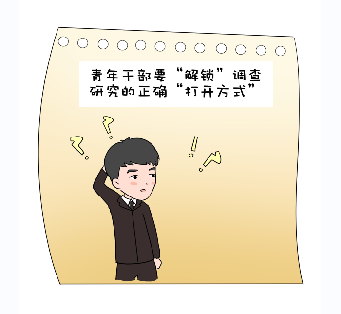 党的二十大报告中指出,全面建设社会主义现代化国家,必须有一支政治过硬、适应新时代要求、具备领导现代化建设能力的干部队伍。青年干部思维敏捷、敢想敢当,普遍具有较高的文化水平和专业素养,是新时代干事创业的生力军。但有限的人生阅历和实践历练使他们在面对复杂性、突发性事务时常常捉襟见肘、顾此失彼。作为我党的优良传统和作风,用好调查研究这个传家宝,坚持学思用贯通、知信行统一,是青年干部特别是刚走出校园的新人缓解“本领恐慌”的“金钥匙”。下面就让我们通过一组漫画来“解锁”调查研究的正确打开方式!