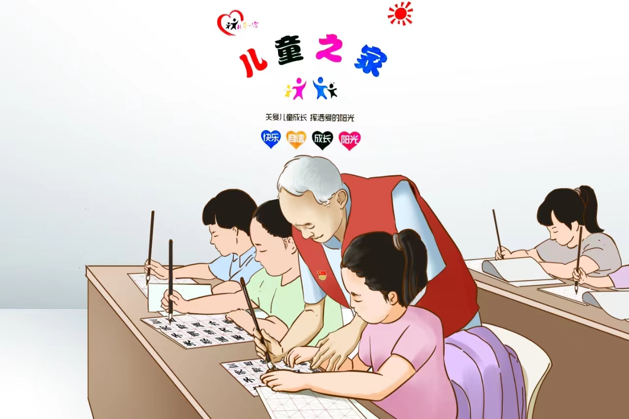 (有文艺特长的老干部在社区“儿童之家”辅导青少年书法练习)