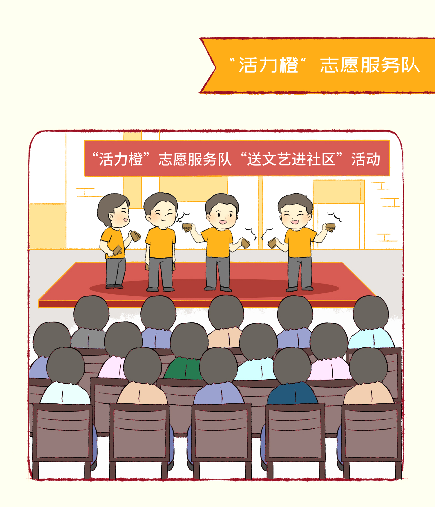 “活力橙”志愿服务队以“文化活动”为主题,以丰富群众文化生活为重点,组织文艺工作者、文艺爱好者等,通过文艺巡演、才艺培训进社区等形式向广大居民传播科学、健康的文体知识,丰富群众文化生活。