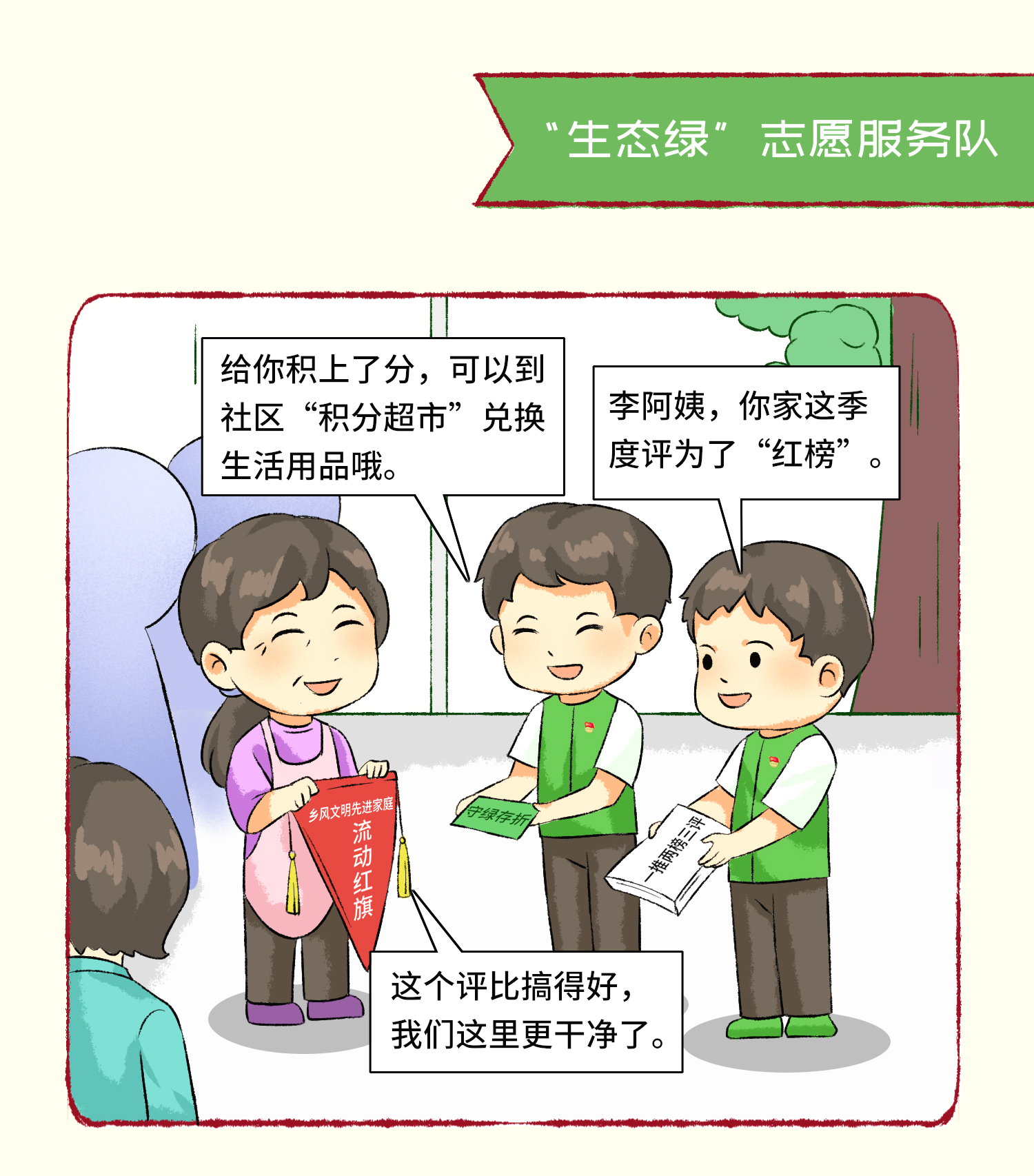 “生态绿”志愿服务队以“环境治理”为主题,以引导居民和家庭增强节约意识、环保意识、生态意识为重点,开展“一推两榜三评”“文明家庭”“绿色家庭”“美丽阳台”等评议活动,为居民创造整洁优美温馨的生活环境。