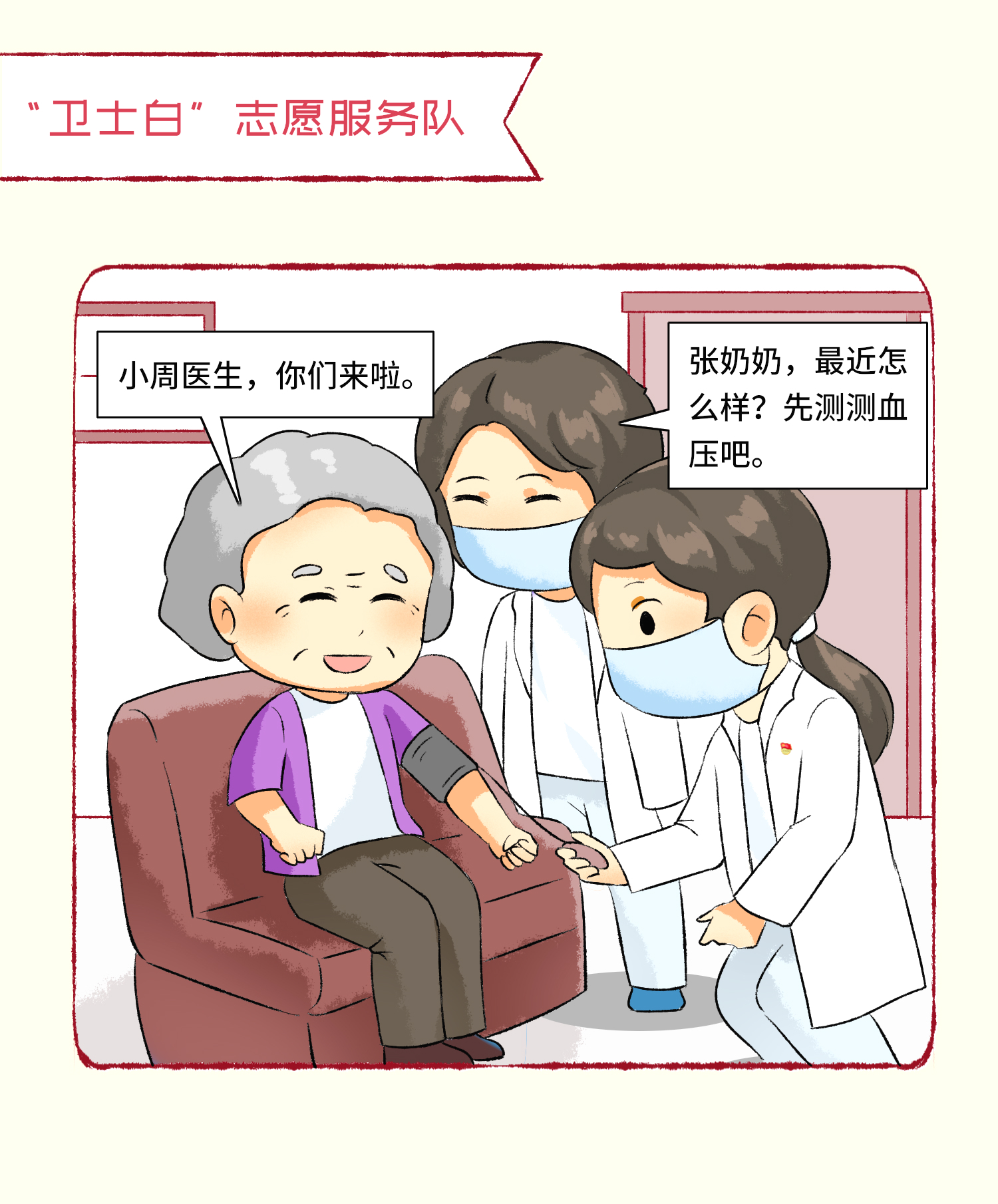 “卫士白”志愿服务队以“健康服务”为主题,以疾病预防为重点,指导居民合理用药、科学饮食,开展健康咨询、义诊服务等活动,围绕“保健康、防重症”目标,突出重点人群管理,加强社区健康服务,保障居民身体健康。